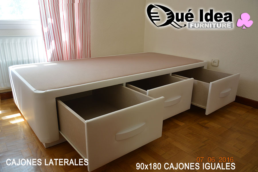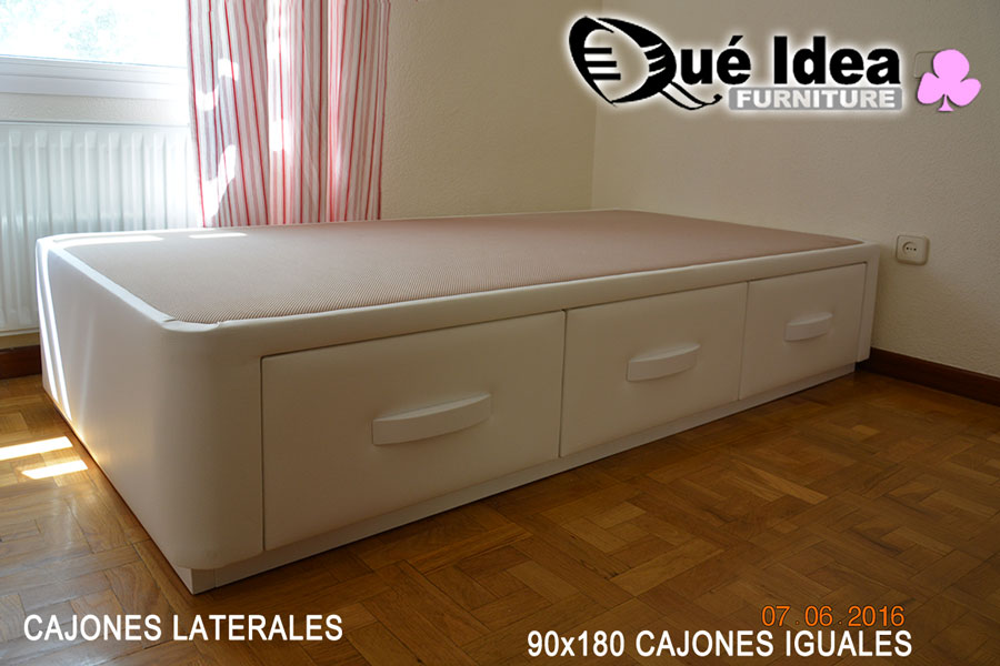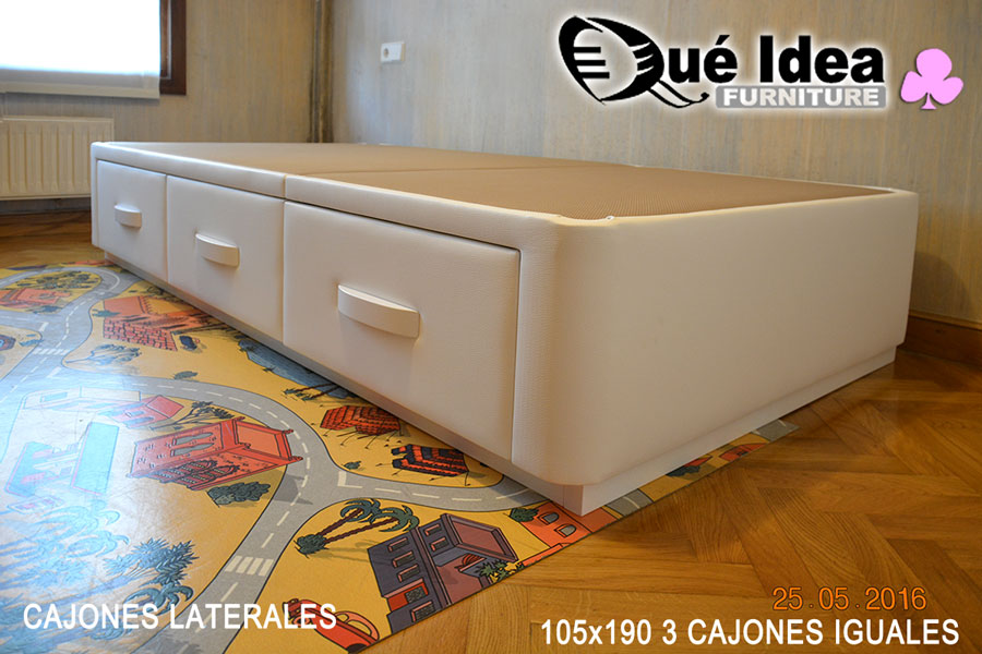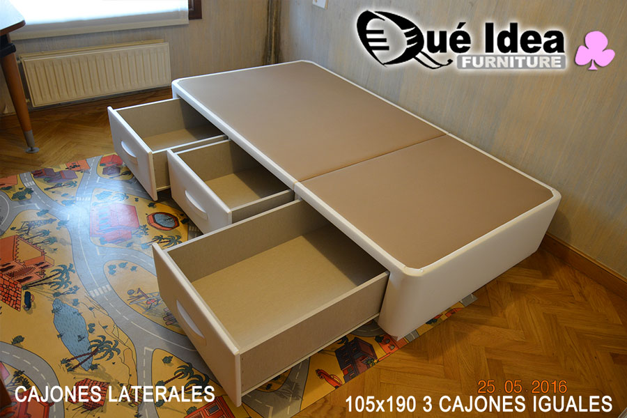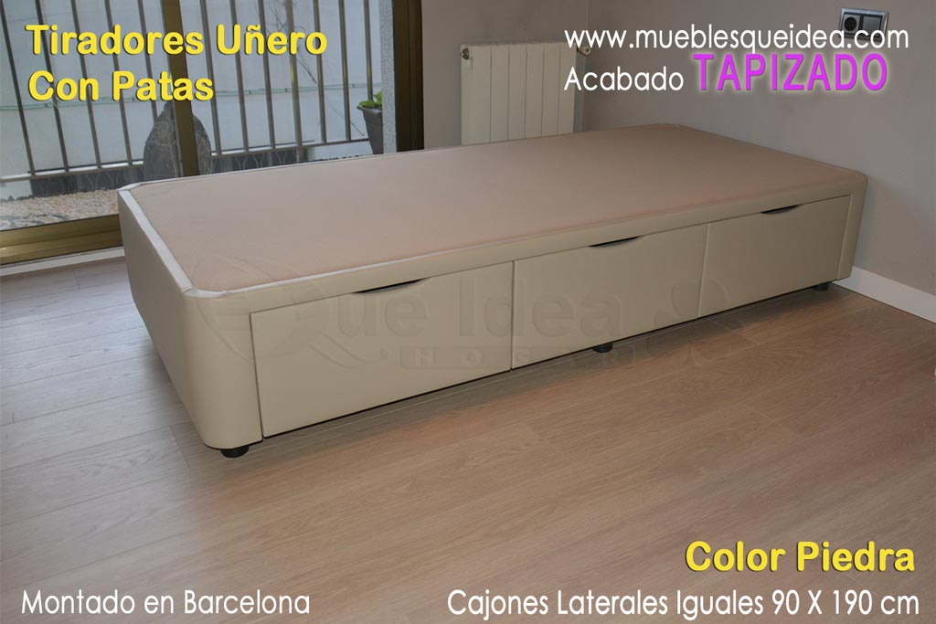 Canapé individual tapizado con tres cajones cerrados iguales de 105 de ancho por 190 de largo.