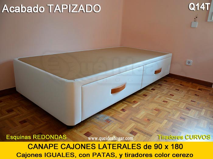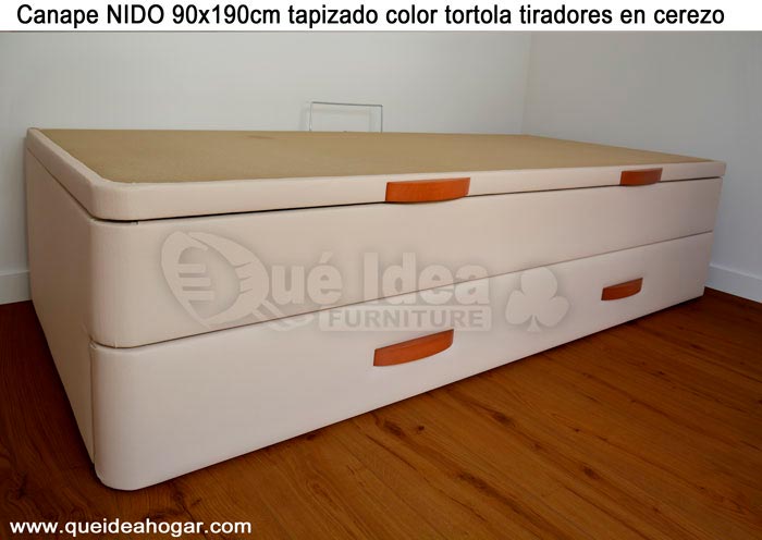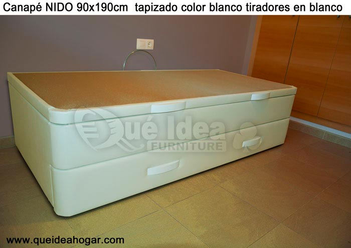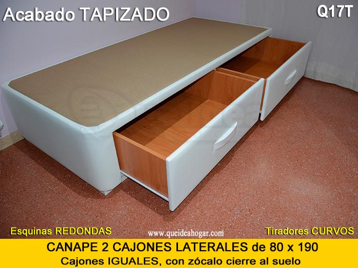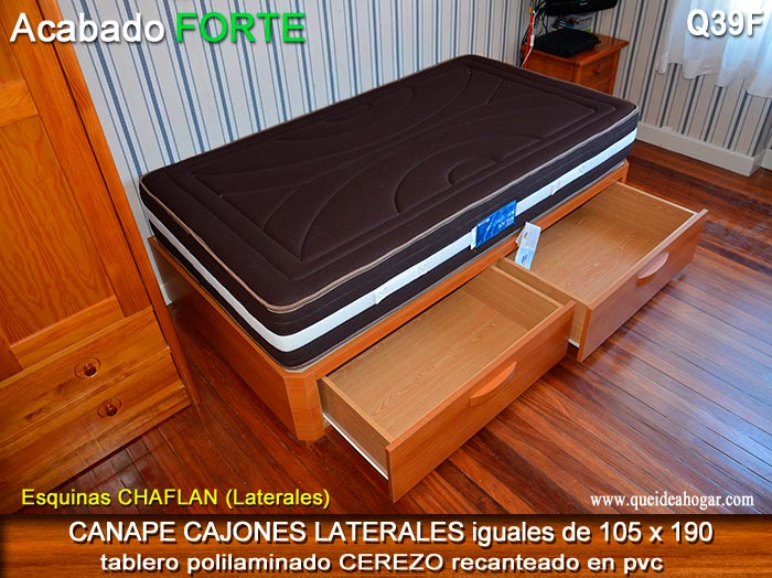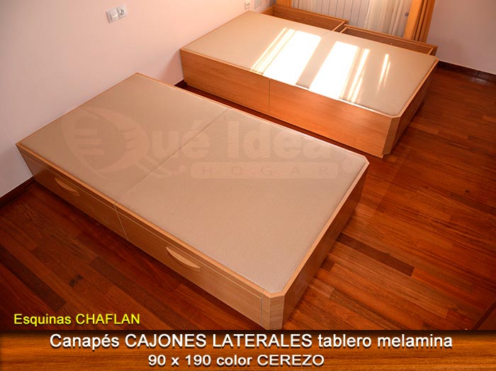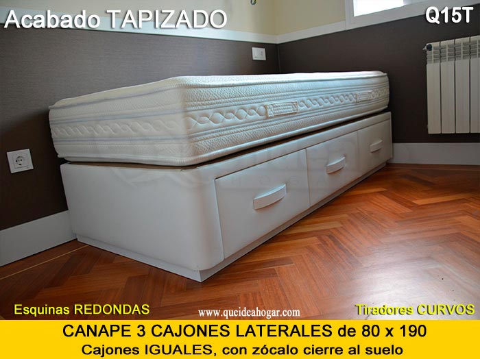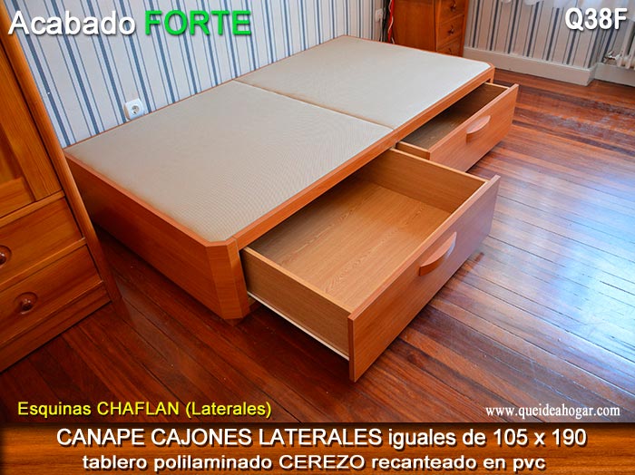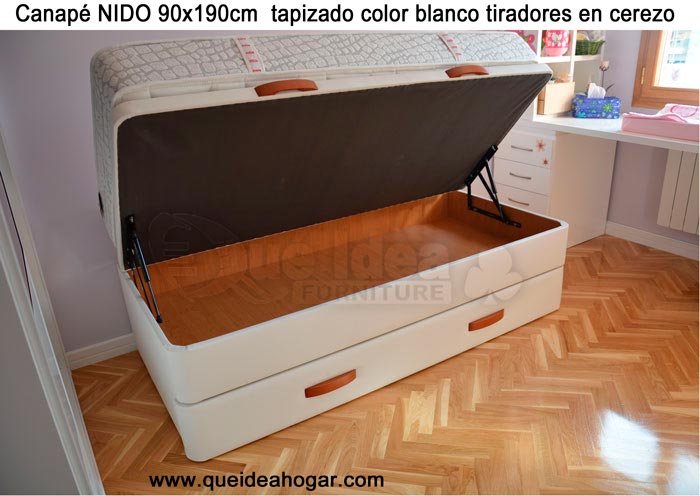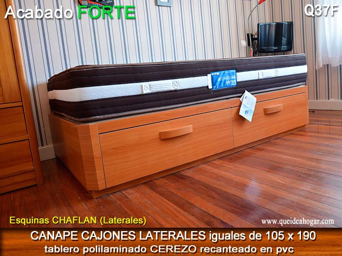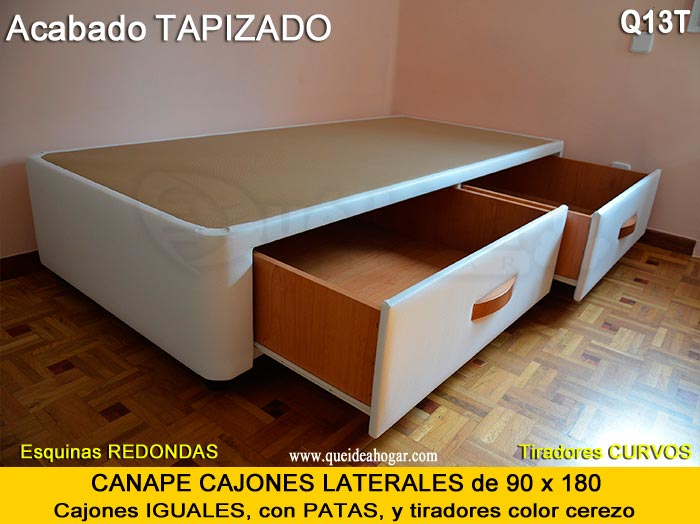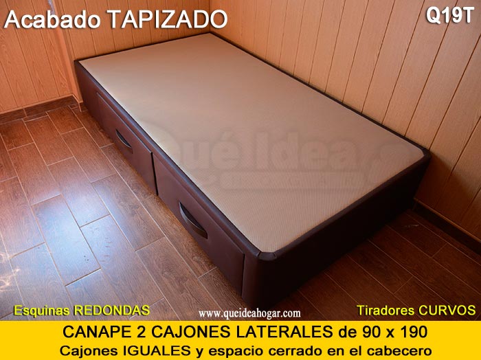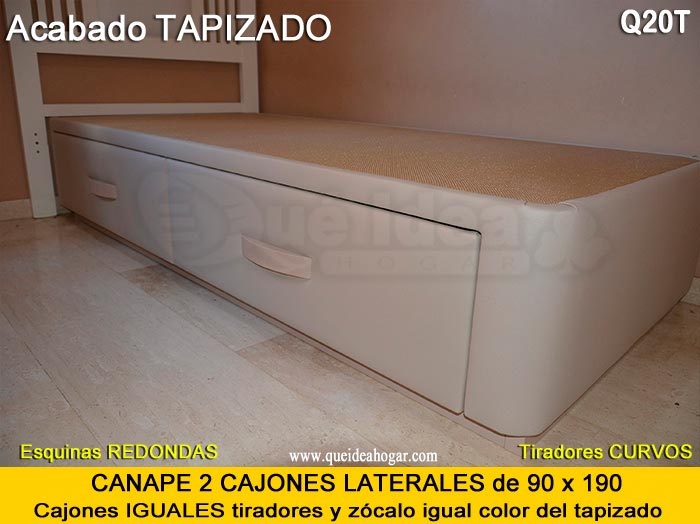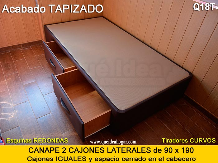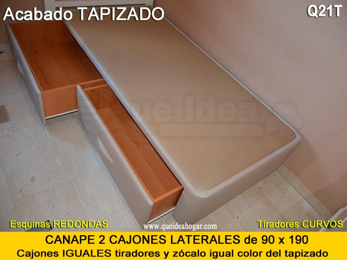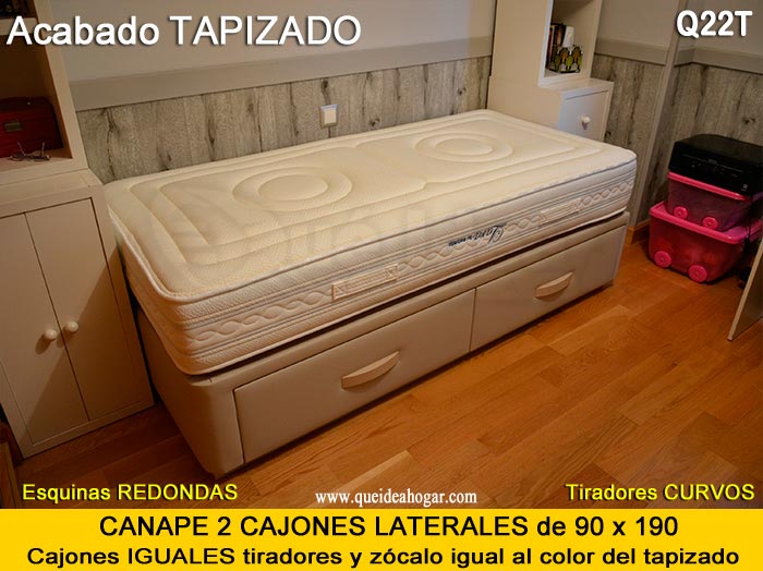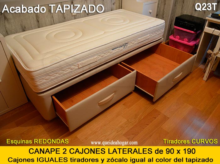 El conjunto de dormitorio ideal es todo ello sobre un canapé de madera con cajones modelo CAJONES LATERALES ya sea con ellos retranqueados o iguales en el lateral. También tenemos un modelo que incorpora un cajón más en los pies y se llama CAJONES PLUS