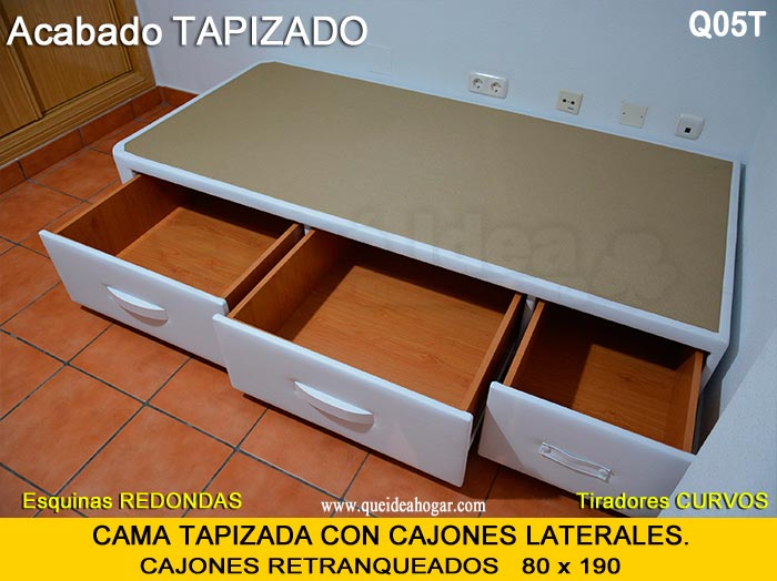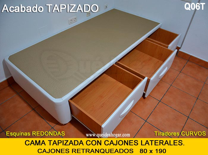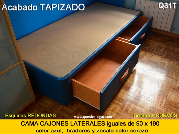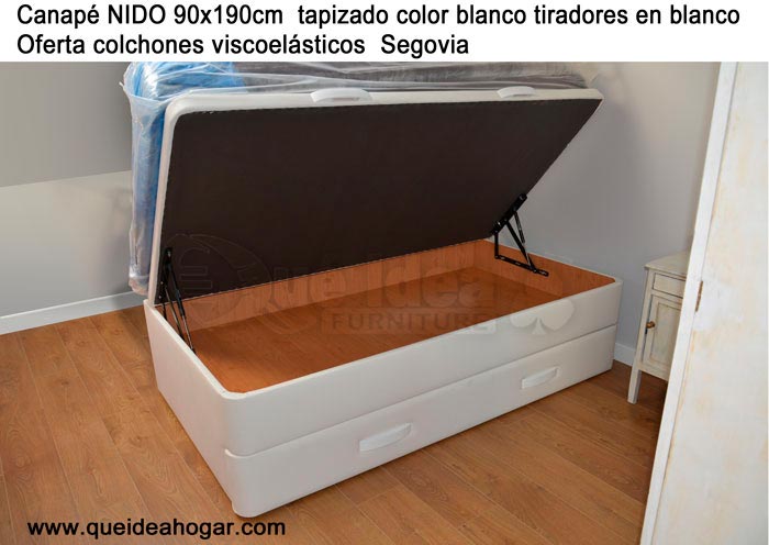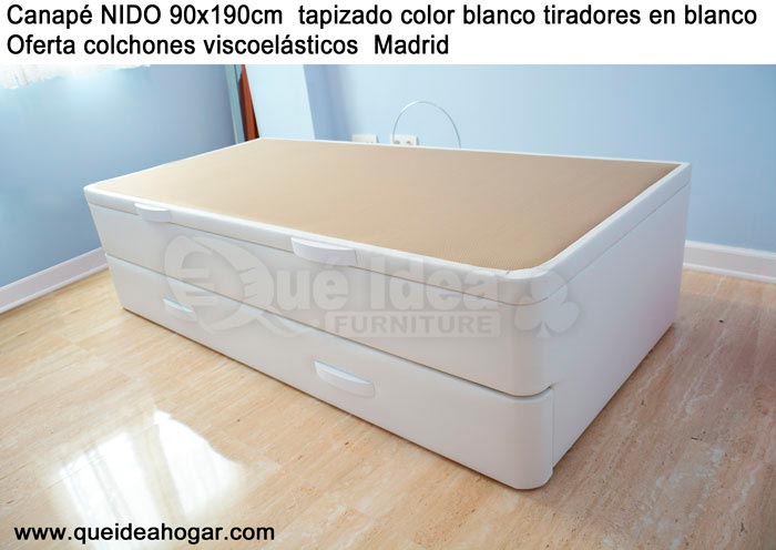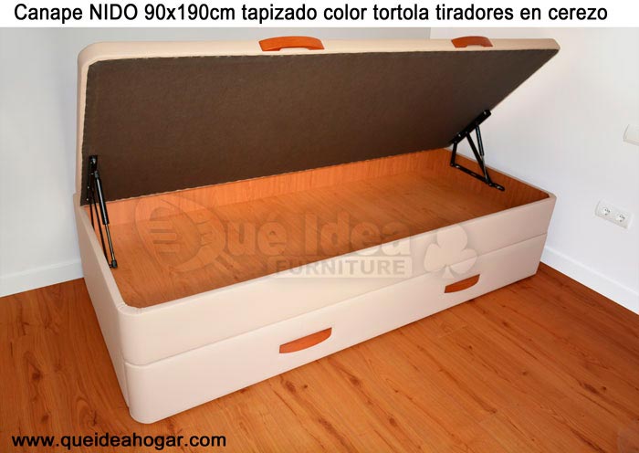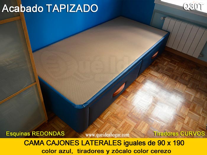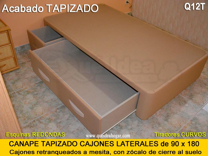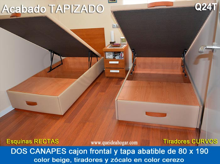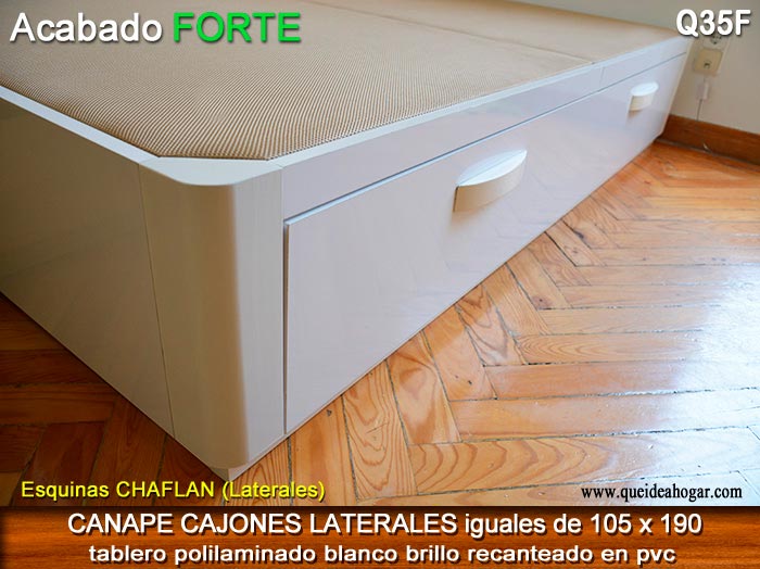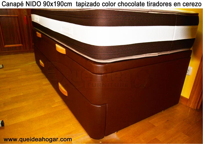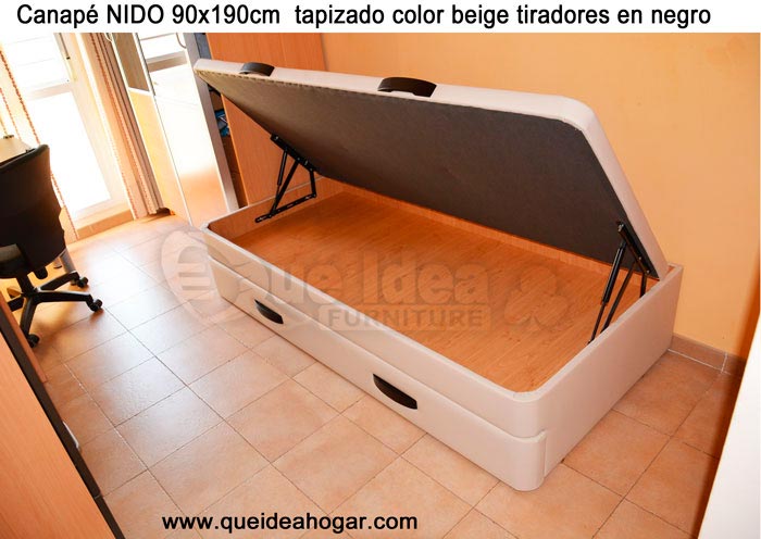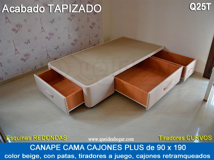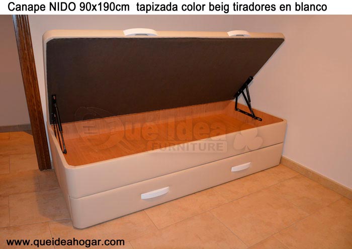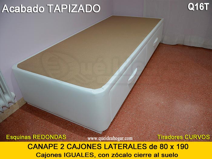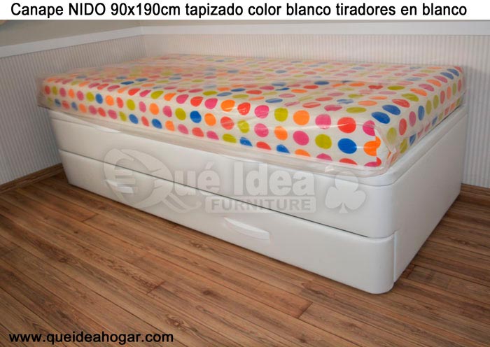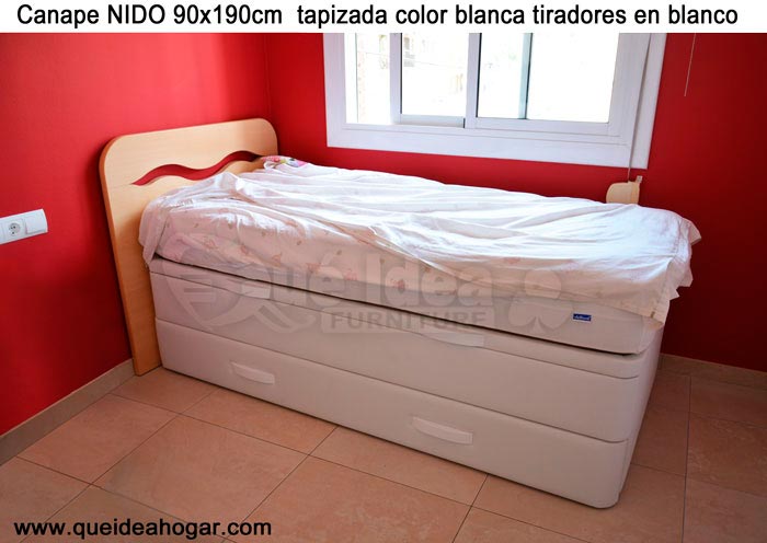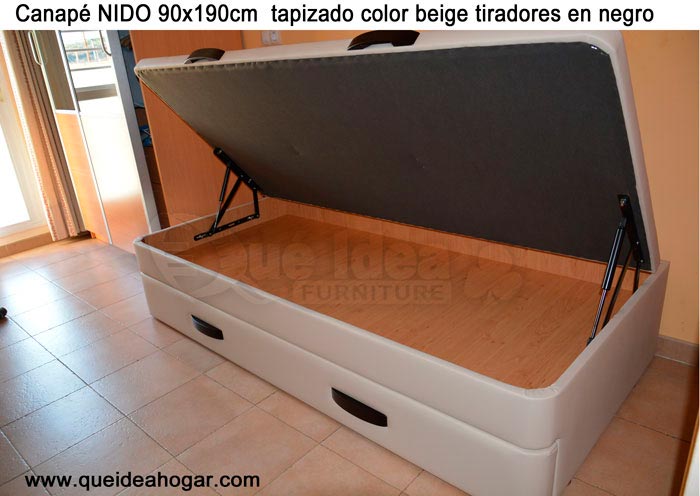 El conjunto de dormitorio ideal es todo ello sobre un canapé de madera con cajones modelo CAJONES LATERALES ya sea con ellos retranqueados o iguales en el lateral. También tenemos un modelo que incorpora un cajón más en los pies y se llama CAJONES PLUS