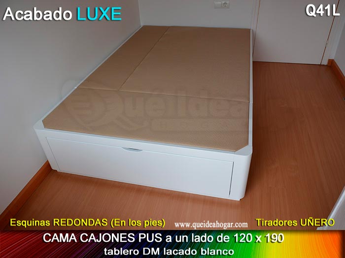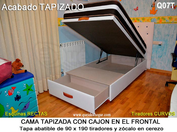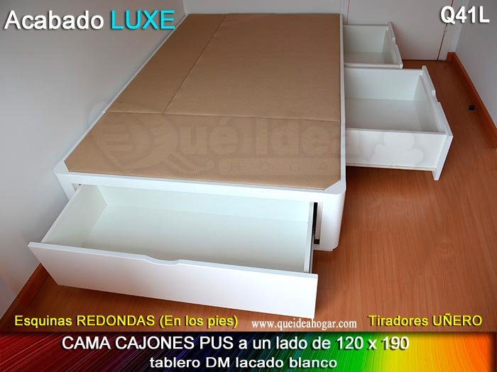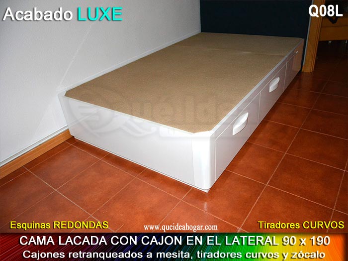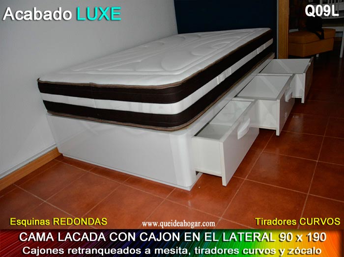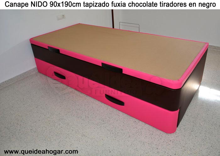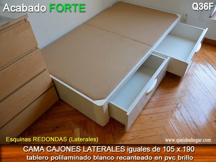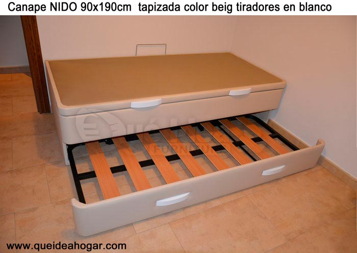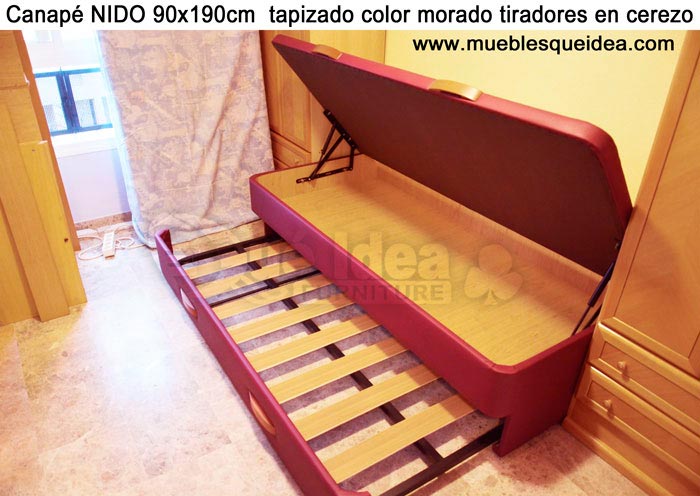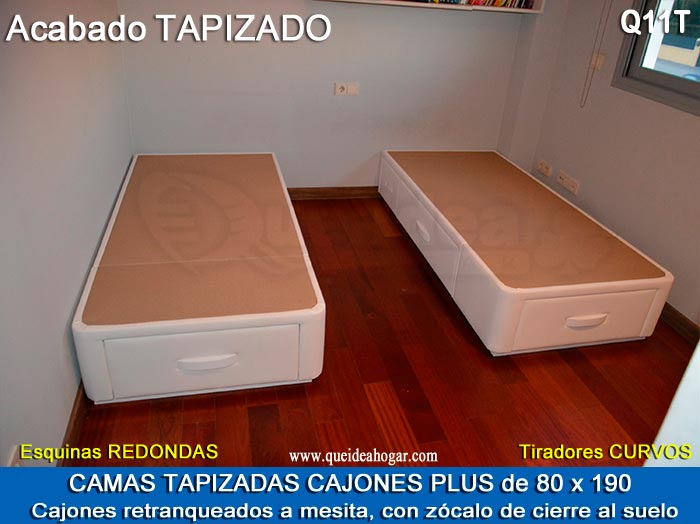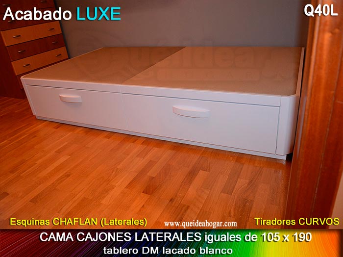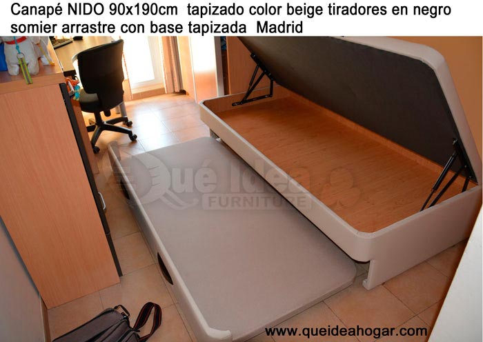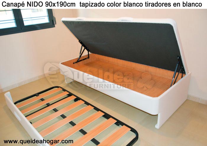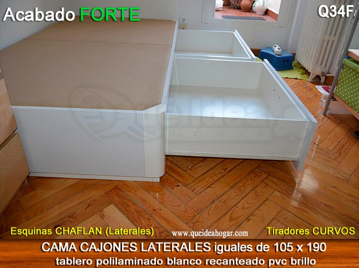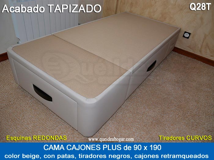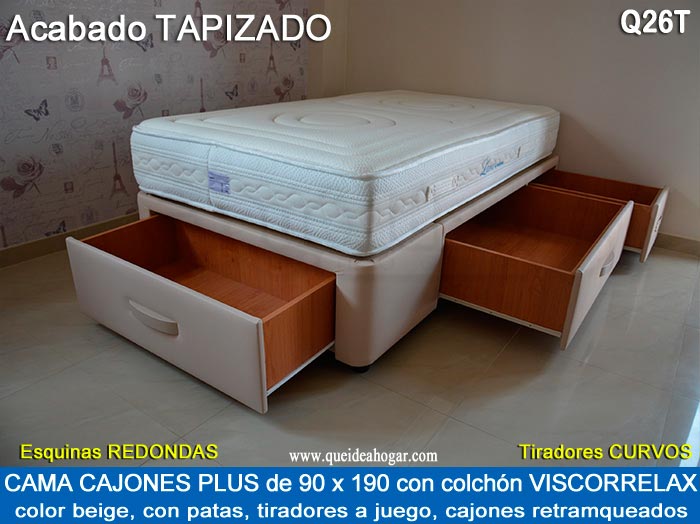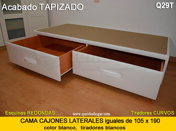 El conjunto de dormitorio ideal es todo ello sobre un canapé de madera con cajones modelo CAJONES LATERALES ya sea con ellos retranqueados o iguales en el lateral. También tenemos un modelo que incorpora un cajón más en los pies y se llama CAJONES PLUS